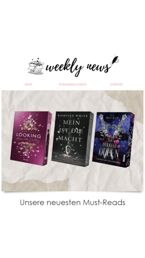 Jeden Sonntag um 12 Uhr versüßen wir unseren Newsletter Abonnent:innen das Wochenende mit neuen Produkten, Buchempfehlungen aus unserem Shop, Neuigkeiten zu Veranstaltungen uvm.!